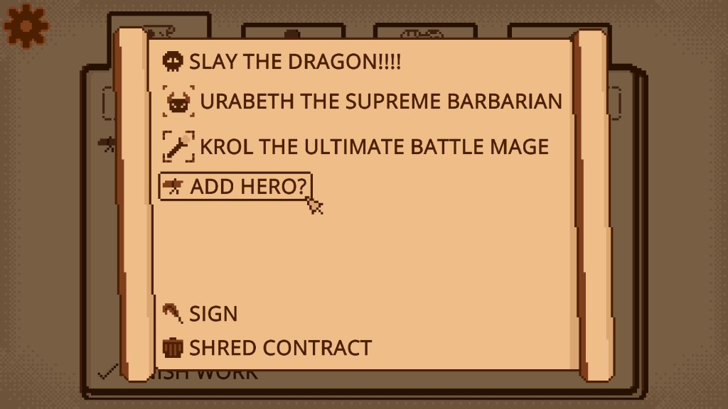 Quest Giver is a humorous narrative adventure with management sim gameplay, divided into 7 story scenarios. In each one, players start a new job as a quest giver NPC: their task is to give out quests to the heroes of the town, pairing them up into contracts based on their hero class and personality, and the type and difficulty of the quest. But the townsfolk, the heroes, and the manager are always making life difficult for them! The player is not the hero, but they still manage to save the day through the power of paperwork.